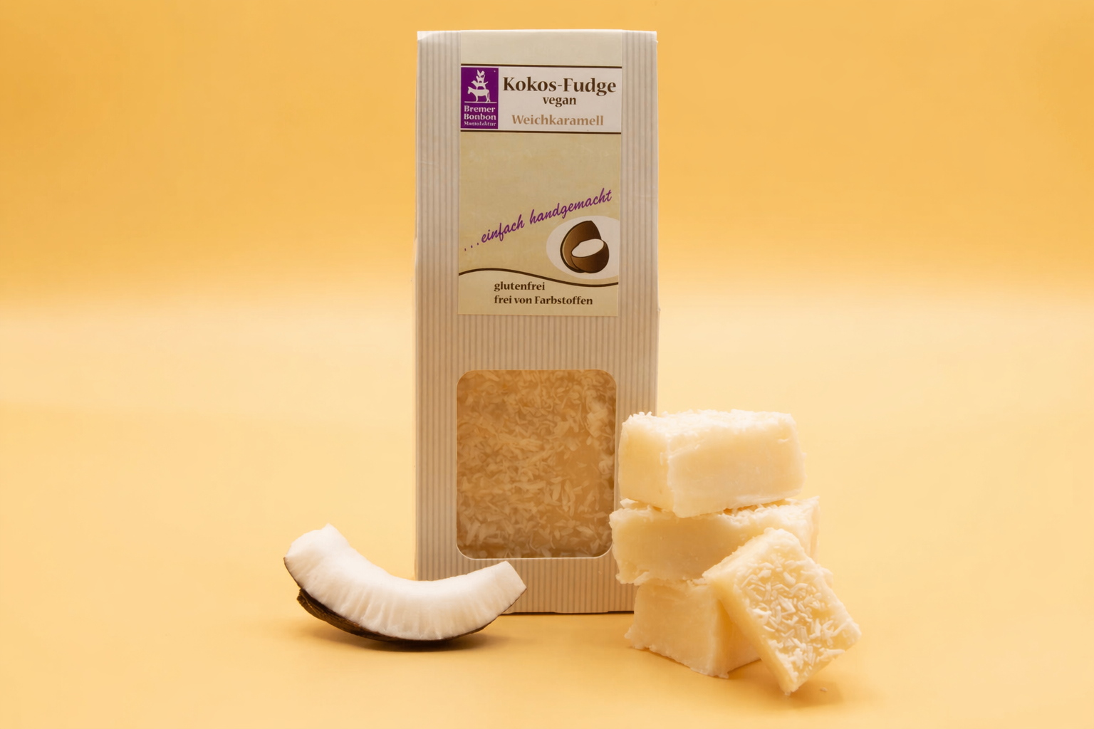 Unser Fudge gibt es aktuell wieder in einer Sommeredition: Lasst euch von unserem köstlichen, zart-schmelzendem Kokosfudge verzaubern. Cooler Tipp für warme Tage: Am besten gekühlt als Snack zum Kaffee oder als Topping auf Joghurt oder Eis genießen. Durch die Herstellung mit Kokosmilch ist die Sorte vegan.
