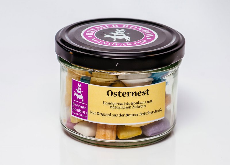 Der Osterhase legt feine Früchtchen in zartem Pastell ins Nest: Holunderblüte, Maracuja, Sanddorn, Erdbeer-Sahne, Brombeere, Blaubeere und Mango.